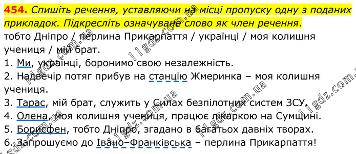 Спишіть речення, уставляючи на місці пропуску одну з поданих прикладок. Підкресліть означуване слово як член речення. тобто Дніпро / перлина Прикарпаття / українці / моя колишня учениця / мій брат. 1. Ми, українці, боронимо свою незалежність. 2. Надвечір потяг прибув на станцію Жмеринка – моя колишня учениця. 3. Тарас, мій брат, служить у Силах безпілотних систем ЗСУ. 4. Олена, моя колишня учениця, працює лікаркою на Сумщині. 5. Борисфен, тобто Дніпро, згадано в багатьох давніх творах. 6. Запрошуємо до Івано–Франківська – перлина Прикарпаття!