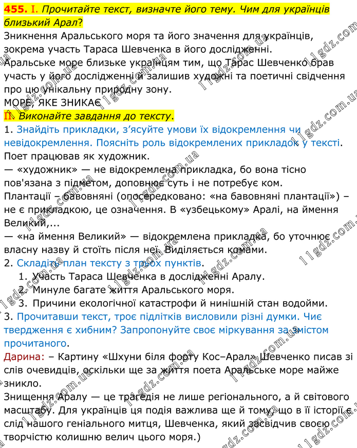 І. Прочитайте текст, визначте його тему. Чим для українців близький Арал? Зникнення Аральського моря та його значення для українців, зокрема участь Тараса Шевченка в його дослідженні. Аральське море близьке українцям тим, що Тарас Шевченко брав участь у його дослідженні й залишив художні та поетичні свідчення про цю унікальну природну зону. МОРЕ, ЯКЕ ЗНИКАЄ II. Виконайте завдання до тексту. 1. Знайдіть прикладки, з’ясуйте умови їх відокремлення чи невідокремлення. Поясніть роль відокремлених прикладок у тексті. Поет працював як художник. — «художник» — не відокремлена прикладка, бо вона тісно пов'язана з підметом, доповнює суть і не потребує ком. Плантації – бавовняні (опосередковано: «на бавовняні плантації») – не є прикладкою, це означення. В «узбецькому» Аралі, на ймення Великий,... — «на ймення Великий» — відокремлена прикладка, бо уточнює власну назву й стоїть після неї. Виділяється комами. 2. Складіть план тексту з трьох пунктів. 1. Участь Тараса Шевченка в дослідженні Аралу. 2. Минуле багате життя Аральського моря. 3. Причини екологічної катастрофи й нинішній стан водойми. 3. Прочитавши текст, троє підлітків висловили різні думки. Чиє твердження є хибним? Запропонуйте своє міркування за змістом прочитаного. Дарина: – Картину «Шхуни біля форту Кос–Арал» Шевченко писав зі слів очевидців, оскільки ще за життя поета Аральське море майже зникло. Знищення Аралу — це трагедія не лише регіонального, а й світового масштабу. Для українців ця подія важлива ще й тому, що в її історії є слід нашого геніального митця, Шевченка, який засвідчив своєю творчістю колишню велич цього моря.)