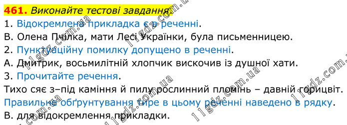 Виконайте тестові завдання. 1. Відокремлена прикладка є в реченні. В. Олена Пчілка, мати Лесі Українки, була письменницею. 2. Пунктуаційну помилку допущено в реченні. А. Дмитрик, восьмилітній хлопчик вискочив із душної хати. 3. Прочитайте речення. Тихо сяє з–під каміння й пилу рослинний пломінь – давній горицвіт. Правильне обґрунтування тире в цьому реченні наведено в рядку. В. для відокремлення прикладки.