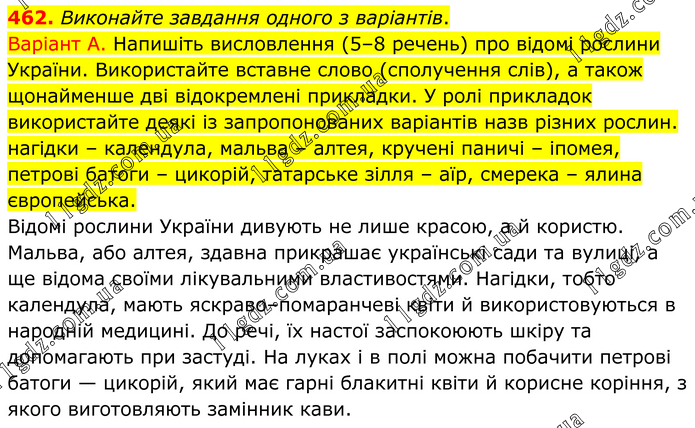 Виконайте завдання одного з варіантів. Варіант А. Напишіть висловлення (5–8 речень) про відомі рослини України. Використайте вставне слово (сполучення слів), а також щонайменше дві відокремлені прикладки. У ролі прикладок використайте деякі із запропонованих варіантів назв різних рослин. нагідки – календула, мальва – алтея, кручені паничі – іпомея, петрові батоги – цикорій, татарське зілля – аїр, смерека – ялина європейська. Відомі рослини України дивують не лише красою, а й користю. Мальва, або алтея, здавна прикрашає українські сади та вулиці, а ще відома своїми лікувальними властивостями. Нагідки, тобто календула, мають яскраво–помаранчеві квіти й використовуються в народній медицині. До речі, їх настої заспокоюють шкіру та допомагають при застуді. На луках і в полі можна побачити петрові батоги — цикорій, який має гарні блакитні квіти й корисне коріння, з якого виготовляють замінник кави.