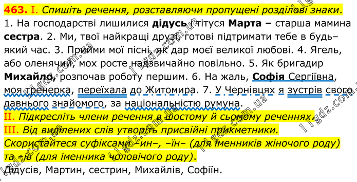 І. Спишіть речення, розставляючи пропущені розділові знаки. 1. На господарстві лишилися дідусь і тітуся Марта – старша мамина сестра. 2. Ми, твої найкращі друзі, готові підтримати тебе в будь–який час. 3. Прийми мої пісні, як дар моєї великої любові. 4. Ягель, або оленячий, мох росте надзвичайно повільно. 5. Як бригадир Михайло, розпочав роботу першим. 6. На жаль, Софія Сергіївна, моя тренерка, переїхала до Житомира. 7. У Чернівцях я зустрів свого давнього знайомого, за національністю румуна. II. Підкресліть члени речення в шостому й сьомому реченнях. III. Від виділених слів утворіть присвійні прикметники. Скористайтеся суфіксами –ин–, –їн– (для іменників жіночого роду) та –ів (для іменника чоловічого роду). Дідусів, Мартин, сестрин, Михайлів, Софіїн.