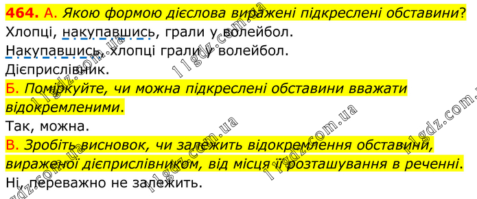 А. Якою формою дієслова виражені підкреслені обставини? Хлопці, накупавшись, грали у волейбол. Накупавшись, хлопці грали у волейбол. Дієприслівник. Б. Поміркуйте, чи можна підкреслені обставини вважати відокремленими. Так, можна. В. Зробіть висновок, чи залежить відокремлення обставини, вираженої дієприслівником, від місця її розташування в реченні. Ні, переважно не залежить.