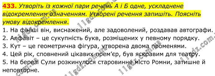 Утворіть із кожної пари речень А і Б одне, ускладнене відокремленим означенням. Утворені речення запишіть. Поясніть умову відокремлення. 1. На фініші він, виснажений, але задоволений, роздавав автографи. 2. Алфавіт – це сукупність букв, розміщених у певному порядку. 3. Кут – це геометрична фігура, утворена двома променями. 4. Цей рік, сповнений цікавих прем’єр, був яскравим для театру. 5. На березі Сули розкинулося старовинне місто Ромни, затишне й неповторне.