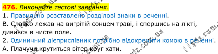 Виконайте тестові завдання. 1. Правильно розставлено розділові знаки в реченні. В. Славко лежав на вигрітій сонцем траві, і спершись на лікті, дивився в чисте поле. 2. Одиничний дієприслівник потрібно відокремити комою в реченні. А. Плачучи крутиться вітер круг хати.