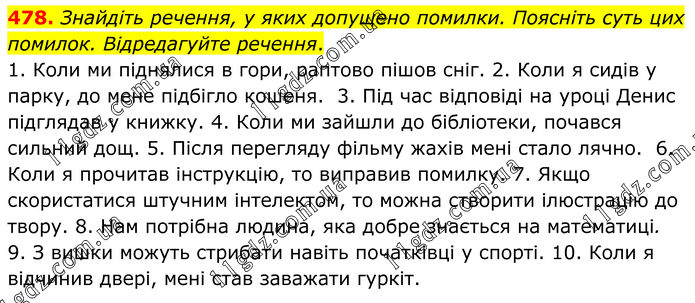 Знайдіть речення, у яких допущено помилки. Поясніть суть цих помилок. Відредагуйте речення. 1. Коли ми піднялися в гори, раптово пішов сніг. 2. Коли я сидів у парку, до мене підбігло кошеня. 3. Під час відповіді на уроці Денис підглядав у книжку. 4. Коли ми зайшли до бібліотеки, почався сильний дощ. 5. Після перегляду фільму жахів мені стало лячно. 6. Коли я прочитав інструкцію, то виправив помилку. 7. Якщо скористатися штучним інтелектом, то можна створити ілюстрацію до твору. 8. Нам потрібна людина, яка добре знається на математиці. 9. З вишки можуть стрибати навіть початківці у спорті. 10. Коли я відчинив двері, мені став заважати гуркіт.