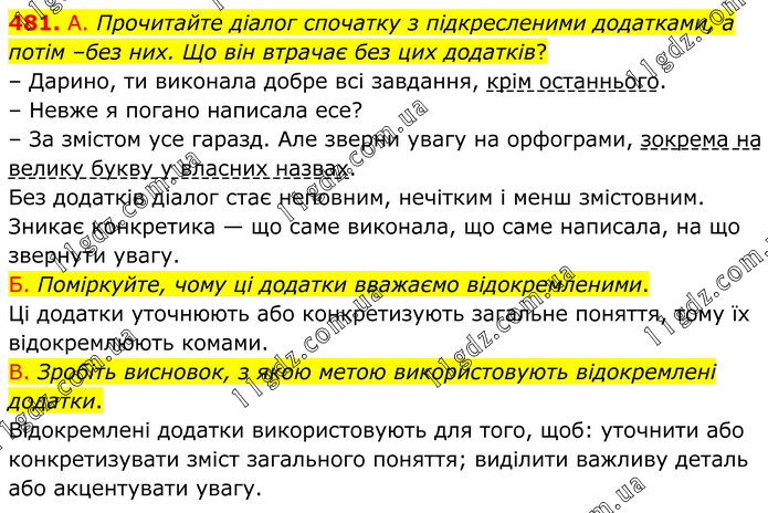 А. Прочитайте діалог спочатку з підкресленими додатками, а потім –без них. Що він втрачає без цих додатків? – Дарино, ти виконала добре всі завдання, крім останнього. – Невже я погано написала есе? – За змістом усе гаразд. Але зверни увагу на орфограми, зокрема на велику букву у власних назвах. Без додатків діалог стає неповним, нечітким і менш змістовним. Зникає конкретика — що саме виконала, що саме написала, на що звернути увагу. Б. Поміркуйте, чому ці додатки вважаємо відокремленими. Ці додатки уточнюють або конкретизують загальне поняття, тому їх відокремлюють комами. В. Зробіть висновок, з якою метою використовують відокремлені додатки. Відокремлені додатки використовують для того, щоб: уточнити або конкретизувати зміст загального поняття; виділити важливу деталь або акцентувати увагу.