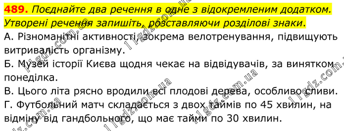 Поєднайте два речення в одне з відокремленим додатком. Утворені речення запишіть, розставляючи розділові знаки. А. Різноманітні активності, зокрема велотренування, підвищують витривалість організму. Б. Музей історії Києва щодня чекає на відвідувачів, за винятком понеділка. В. Цього літа рясно вродили всі плодові дерева, особливо сливи. Г. Футбольний матч складається з двох таймів по 45 хвилин, на відміну від гандбольного, що має тайми по 30 хвилин.