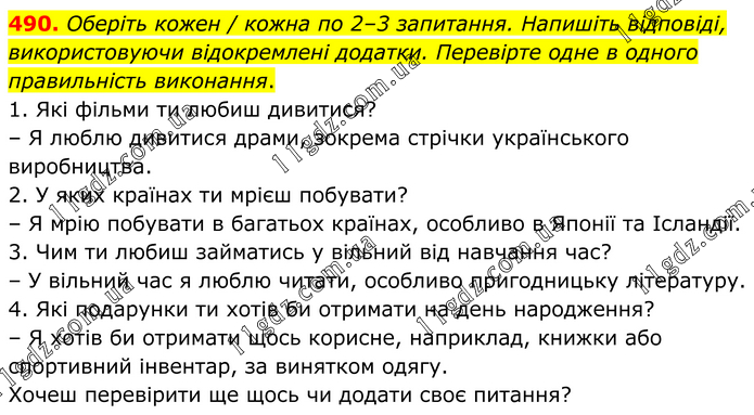 Оберіть кожен / кожна по 2–3 запитання. Напишіть відповіді, використовуючи відокремлені додатки. Перевірте одне в одного правильність виконання. 1. Які фільми ти любиш дивитися? – Я люблю дивитися драми, зокрема стрічки українського виробництва. 2. У яких країнах ти мрієш побувати? – Я мрію побувати в багатьох країнах, особливо в Японії та Ісландії. 3. Чим ти любиш займатись у вільний від навчання час? – У вільний час я люблю читати, особливо пригодницьку літературу. 4. Які подарунки ти хотів би отримати на день народження? – Я хотів би отримати щось корисне, наприклад, книжки або спортивний інвентар, за винятком одягу. Хочеш перевірити ще щось чи додати своє питання?