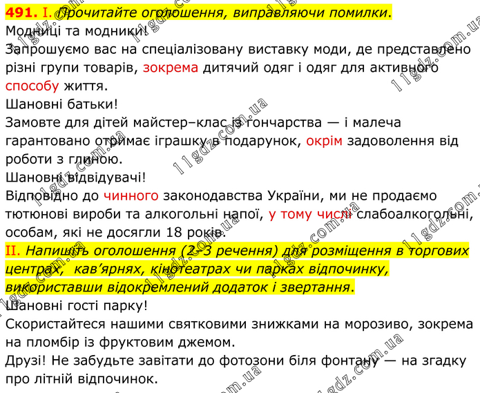 І. Прочитайте оголошення, виправляючи помилки. Модниці та модники! Запрошуємо вас на спеціалізовану виставку моди, де представлено різні групи товарів, зокрема дитячий одяг і одяг для активного способу життя. Шановні батьки! Замовте для дітей майстер–клас із гончарства — і малеча гарантовано отримає іграшку в подарунок, окрім задоволення від роботи з глиною. Шановні відвідувачі! Відповідно до чинного законодавства України, ми не продаємо тютюнові вироби та алкогольні напої, у тому числі слабоалкогольні, особам, які не досягли 18 років. ІІ. Напишіть оголошення (2–3 речення) для розміщення в торгових центрах, кав’ярнях, кінотеатрах чи парках відпочинку, використавши відокремлений додаток і звертання. Шановні гості парку! Скористайтеся нашими святковими знижками на морозиво, зокрема на пломбір із фруктовим джемом. Друзі! Не забудьте завітати до фотозони біля фонтану — на згадку про літній відпочинок.