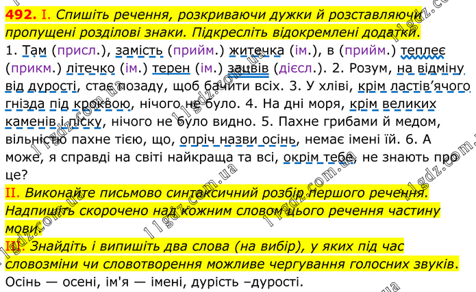 І. Спишіть речення, розкриваючи дужки й розставляючи пропущені розділові знаки. Підкресліть відокремлені додатки. 1. Там (присл.), замість (прийм.) житечка (ім.), в (прийм.) теплеє (прикм.) літечко (ім.) терен (ім.) зацвів (дієсл.). 2. Розум, на відміну від дурості, стає позаду, щоб бачити всіх. 3. У хліві, крім ластів’ячого гнізда під кроквою, нічого не було. 4. На дні моря, крім великих каменів і піску, нічого не було видно. 5. Пахне грибами й медом, вільністю пахне тією, що, опріч назви осінь, немає імені їй. 6. А може, я справді на світі найкраща та всі, окрім тебе, не знають про це? II. Виконайте письмово синтаксичний розбір першого речення. Надпишіть скорочено над кожним словом цього речення частину мови. III. Знайдіть і випишіть два слова (на вибір), у яких під час словозміни чи словотворення можливе чергування голосних звуків. Осінь — осені, ім'я — імені, дурість –дурості.