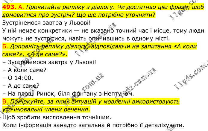А. Прочитайте репліку з діалогу. Чи достатньо цієї фрази, щоб домовитися про зустріч? Що ще потрібно уточнити? Зустрінемося завтра у Львові! У ній немає конкретики — не вказано точний час і місце, тому люди можуть не зустрітися, навіть опинившись в одному місті. Б. Доповніть репліку діалогу, відповідаючи на запитання «А коли саме?», «А де саме?». – Зустрінемося завтра у Львові! – А коли саме? – О 14:00. – А де саме? – На площі Ринок, біля фонтану з Нептуном. В. Поміркуйте, за яких ситуацій у мовленні використовують уточнювальні члени речення. Щоб зробити висловлення точнішим. Коли інформація занадто загальна й потрібно її деталізувати.