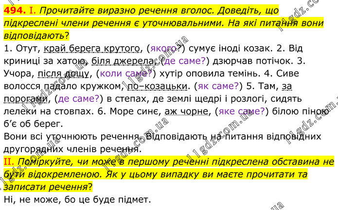 І. Прочитайте виразно речення вголос. Доведіть, що підкреслені члени речення є уточнювальними. На які питання вони відповідають? 1. Отут, край берега крутого, (якого?) сумує іноді козак. 2. Від криниці за хатою, біля джерела, (де саме?) дзюрчав потічок. 3. Учора, після дощу, (коли саме?) хутір оповила темінь. 4. Сиве волосся падало кружком, по–козацьки. (як саме?) 5. Там, за порогами, (де саме?) в степах, де землі щедрі і розлогі, сидять лелеки на стовпах. 6. Море синє, аж чорне, (яке саме?) білою піною б’є об берег. Вони всі уточнюють речення. Відповідають на питання відповідних другорядних членів речення. II. Поміркуйте, чи може в першому реченні підкреслена обставина не бути відокремленою. Як у цьому випадку ви маєте прочитати та записати речення? Ні, не може, бо це буде підмет.