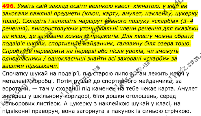 Уявіть свій заклад освіти великою квест–кімнатою, у якій ви заховали важливі предмети (ключ, карту, амулет, наклейку, цукерку тощо). Складіть і запишіть маршрут уявного пошуку «скарбів» (3–4 речення), використовуючи уточнювальні члени речення для вказівки на місця, де заховано кожен із предметів. Для квесту можна обрати подвір’я школи, спортивний майданчик, галявину біля озера тощо. Спробуйте перевірити на перерві або після уроків, чи зможуть однокласники / однокласниці знайти всі заховані «скарби» за вашими підказками. Спочатку шукай на подвір’ї, під старою липою, там лежить ключ у металевій коробці. Потім рушай до спортивного майданчика, за воротами, — там у схованці під каменем на тебе чекає карта. Амулет знайдеш у шкільному коридорі, біля дошки оголошень, серед кольорових листівок. А цукерку з наклейкою шукай у класі, на підвіконні праворуч, вона загорнута в пакунок із синьою стрічкою.