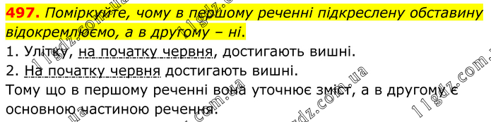 Поміркуйте, чому в першому реченні підкреслену обставину відокремлюємо, а в другому – ні. 1. Улітку, на початку червня, достигають вишні. 2. На початку червня достигають вишні. Тому що в першому реченні вона уточнює зміст, а в другому є основною частиною речення.