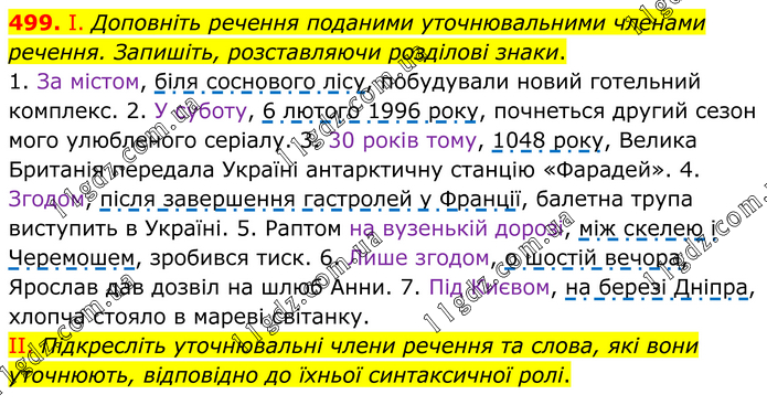 І. Доповніть речення поданими уточнювальними членами речення. Запишіть, розставляючи розділові знаки. 1. За містом, біля соснового лісу, побудували новий готельний комплекс. 2. У суботу, 6 лютого 1996 року, почнеться другий сезон мого улюбленого серіалу. 3. 30 років тому, 1048 року, Велика Британія передала Україні антарктичну станцію «Фарадей». 4. Згодом, після завершення гастролей у Франції, балетна трупа виступить в Україні. 5. Раптом на вузенькій дорозі, між скелею і Черемошем, зробився тиск. 6. Лише згодом, о шостій вечора, Ярослав дав дозвіл на шлюб Анни. 7. Під Києвом, на березі Дніпра, хлопча стояло в мареві світанку. II. Підкресліть уточнювальні члени речення та слова, які вони уточнюють, відповідно до їхньої синтаксичної ролі.