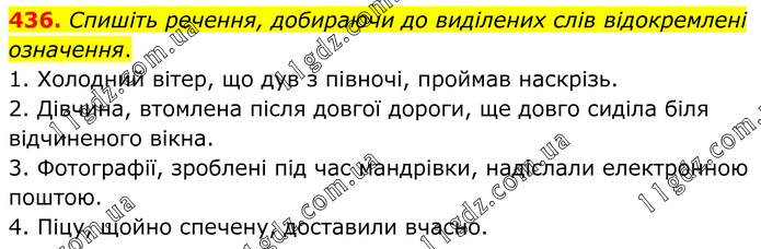 Спишіть речення, добираючи до виділених слів відокремлені означення. 1. Холодний вітер, що дув з півночі, проймав наскрізь. 2. Дівчина, втомлена після довгої дороги, ще довго сиділа біля відчиненого вікна. 3. Фотографії, зроблені під час мандрівки, надіслали електронною поштою. 4. Піцу, щойно спечену, доставили вчасно.