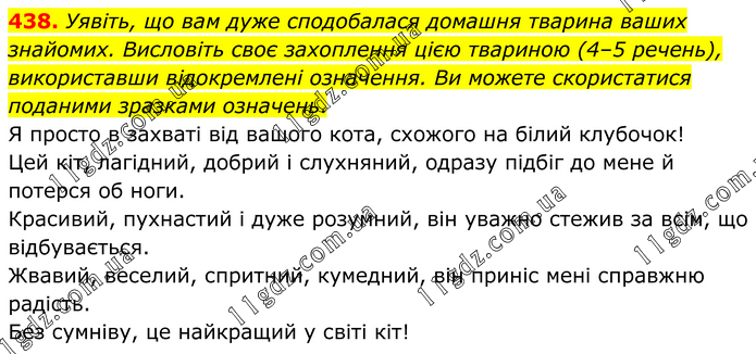 Уявіть, що вам дуже сподобалася домашня тварина ваших знайомих. Висловіть своє захоплення цією твариною (4–5 речень), використавши відокремлені означення. Ви можете скористатися поданими зразками означень. Я просто в захваті від вашого кота, схожого на білий клубочок! Цей кіт, лагідний, добрий і слухняний, одразу підбіг до мене й потерся об ноги. Красивий, пухнастий і дуже розумний, він уважно стежив за всім, що відбувається. Жвавий, веселий, спритний, кумедний, він приніс мені справжню радість. Без сумніву, це найкращий у світі кіт!