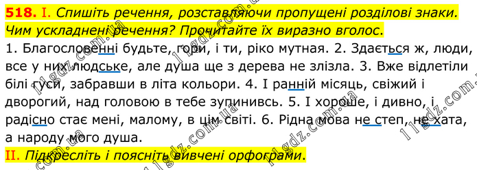 І. Спишіть речення, розставляючи пропущені розділові знаки. Чим ускладнені речення? Прочитайте їх виразно вголос. 1. Благословенні будьте, гори, і ти, ріко мутная. 2. Здається ж, люди, все у них людське, але душа ще з дерева не злізла. 3. Вже відлетіли білі гуси, забравши в літа кольори. 4. І ранній місяць, свіжий і дворогий, над головою в тебе зупинивсь. 5. І хороше, і дивно, і радісно стає мені, малому, в цім світі. 6. Рідна мова не степ, не хата, а народу мого душа. II. Підкресліть і поясніть вивчені орфограми.