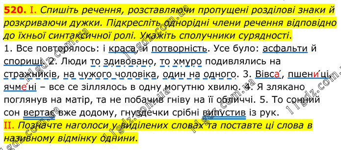 І. Спишіть речення, розставляючи пропущені розділові знаки й розкриваючи дужки. Підкресліть однорідні члени речення відповідно до їхньої синтаксичної ролі. Укажіть сполучники сурядності. 1. Все повторялось: і краса, й потворність. Усе було: асфальти й спориші. 2. Люди то здивовано, то хмуро подивлялись на стражників, на чужого чоловіка, один на одного. 3. Вівса՛, пшени՛ці, ячме՛ні – все се зіллялось в одну могутню хвилю. 4. Я злякано поглянув на матір, та не побачив гніву на її обличчі. 5. То сонний сон вертає вже додому, гнуздечки срібні випустив із рук. II. Позначте наголоси у виділених словах та поставте ці слова в називному відмінку однини.