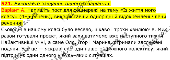 Виконайте завдання одного з варіантів. Варіант А. Напишіть пост для соцмережі на тему «Із життя мого класу» (4–5 речень), використавши однорідні й відокремлені члени речення. Сьогодні в нашому класі було весело, цікаво і трохи хвилююче. Ми разом готували проєкт, який захищатимемо вже наступного тижня. Найактивніші учні, а саме Оля, Ігор і Марина, отримали заслужені подяки. Усе це — яскраві спогади нашого дружного колективу, який підтримує один одного у будь–яких ситуаціях.