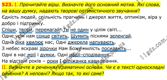 І. Прочитайте вірш. Визначте його основний мотив. Які слова, на вашу думку, надають творові оптимістичного звучання? Єдність людей, спільність прагнень і джерел життя, оптимізм, віра у добро і підтримку. Спіши, твори, перемагай! Ти не один у цілім світі... Одне усім нам сонце світить, Шумить піснями зеленгай. Одна ріка хвилює нас, Одні джерела напувають, З небес яскраві зірочки Нам Божу милість посилають... Одні в нас мрії і думки, Одні надії–сподівання... На відстані років – роки І філіжанка кави зрання. II. Визначте в реченнях граматичні основи. Чи є в тексті односкладні речення? А неповні? Якщо так, то які саме?