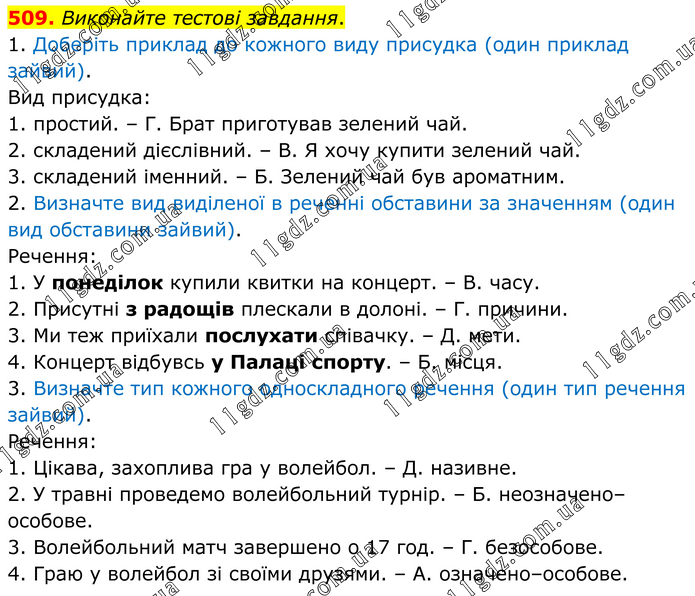 Виконайте тестові завдання. 1. Доберіть приклад до кожного виду присудка (один приклад зайвий). Вид присудка: 1. простий. – Г. Брат приготував зелений чай. 2. складений дієслівний. – В. Я хочу купити зелений чай. 3. складений іменний. – Б. Зелений чай був ароматним. 2. Визначте вид виділеної в реченні обставини за значенням (один вид обставини зайвий). Речення: 1. У понеділок купили квитки на концерт. – В. часу. 2. Присутні з радощів плескали в долоні. – Г. причини. 3. Ми теж приїхали послухати співачку. – Д. мети. 4. Концерт відбувсь у Палаці спорту. – Б. місця. 3. Визначте тип кожного односкладного речення (один тип речення зайвий). Речення: 1. Цікава, захоплива гра у волейбол. – Д. називне. 2. У травні проведемо волейбольний турнір. – Б. неозначено–особове. 3. Волейбольний матч завершено о 17 год. – Г. безособове. 4. Граю у волейбол зі своїми друзями. – А. означено–особове.