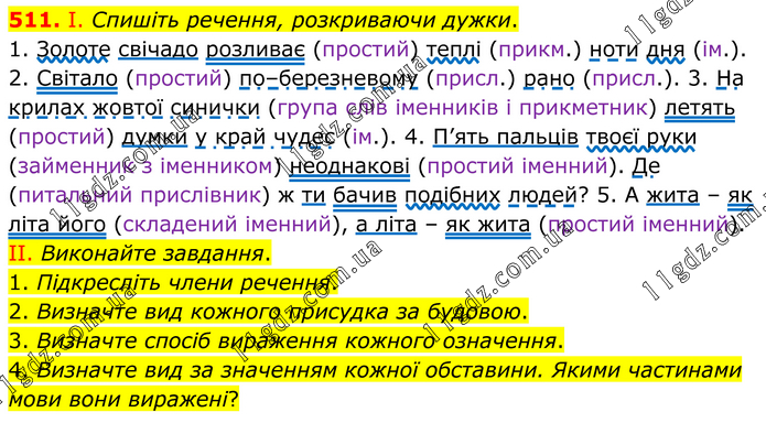 І. Спишіть речення, розкриваючи дужки. 1. Золоте свічадо розливає (простий) теплі (прикм.) ноти дня (ім.). 2. Світало (простий) по–березневому (присл.) рано (присл.). 3. На крилах жовтої синички (група слів іменників і прикметник) летять (простий) думки у край чудес (ім.). 4. П’ять пальців твоєї руки (займенник з іменником) неоднакові (простий іменний). Де (питальний прислівник) ж ти бачив подібних людей? 5. А жита – як літа його (складений іменний), а літа – як жита (простий іменний). II. Виконайте завдання. 1. Підкресліть члени речення. 2. Визначте вид кожного присудка за будовою. 3. Визначте спосіб вираження кожного означення. 4. Визначте вид за значенням кожної обставини. Якими частинами мови вони виражені?