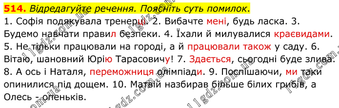 Відредагуйте речення. Поясніть суть помилок. 1. Софія подякувала тренерці. 2. Вибачте мені, будь ласка. 3. Будемо навчати правил безпеки. 4. Їхали й милувалися краєвидами. 5. Не тільки працювали на городі, а й працювали також у саду. 6. Вітаю, шановний Юрію Тарасовичу! 7. Здається, сьогодні буде злива. 8. А ось і Наталя, переможниця олімпіади. 9. Поспішаючи, ми таки опинилися під дощем. 10. Матвій назбирав більше білих грибів, а Олесь - опеньків.