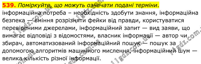 539. Поміркуйте, що можуть означати подані терміни. інформаційна потреба – необхідність здобути знання, інформаційна безпека — вміння розрізняти фейки від правди, користуватися перевіреними джерелами, інформаційний запит — вид заяви, що вимагає відповіді з відомостями, власник інформації — автор чи збирач, автоматизований інформаційний пошук — пошук за допомогою алгоритмів машинного мислення, інформаційний шум — велика кількість різної інформації.