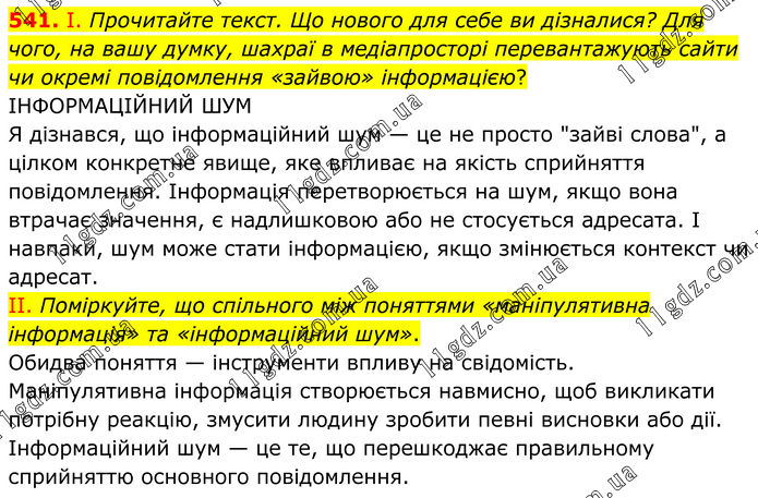 541. І. Прочитайте текст. Що нового для себе ви дізналися? Для чого, на вашу думку, шахраї в медіапросторі перевантажують сайти чи окремі повідомлення «зайвою» інформацією? ІНФОРМАЦІЙНИЙ ШУМ Я дізнався, що інформаційний шум — це не просто "зайві слова", а цілком конкретне явище, яке впливає на якість сприйняття повідомлення. Інформація перетворюється на шум, якщо вона втрачає значення, є надлишковою або не стосується адресата. І навпаки, шум може стати інформацією, якщо змінюється контекст чи адресат. II. Поміркуйте, що спільного між поняттями «маніпулятивна інформація» та «інформаційний шум». Обидва поняття — інструменти впливу на свідомість. Маніпулятивна інформація створюється навмисно, щоб викликати потрібну реакцію, змусити людину зробити певні висновки або дії. Інформаційний шум — це те, що перешкоджає правильному сприйняттю основного повідомлення.