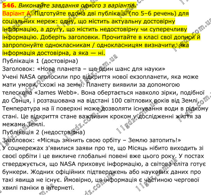 546. Виконайте завдання одного з варіантів. Варіант А. Підготуйте вдома дві публікації (по 5–6 речень) для соціальних мереж: одну, що містить актуальну достовірну інформацію, а другу, що містить недостовірну чи суперечливу інформацію. Доберіть заголовки. Прочитайте в класі свої дописи й запропонуйте однокласникам / однокласницям визначити, яка інформація достовірна, а яка — ні. Публікація 1 (достовірна) Заголовок: «Нова планета – ще один шанс для науки» Учені NASA оголосили про відкриття нової екзопланети, яка може мати умови, схожі на земні. Планету виявили за допомогою телескопа «James Webb». Вона обертається навколо зірки, подібної до Сонця, і розташована на відстані 100 світлових років від Землі. Температура на її поверхні може дозволяти існування води в рідкому стані. Це відкриття стане важливим кроком у дослідженні життя за межами Землі. Публікація 2 (недостовірна) Заголовок: «Місяць змінить свою орбіту – Землю затопить!» У соцмережах з'явилися заяви про те, що Місяць нібито виходить зі своєї орбіти і це викличе глобальні повені вже цього року. У постах стверджується, що NASA приховує інформацію, а світова еліта готує бункери. Жодних офіційних підтверджень або наукових даних про такі явища не існує. Ймовірно, ця інформація є частиною чергової хвилі паніки в інтернеті.