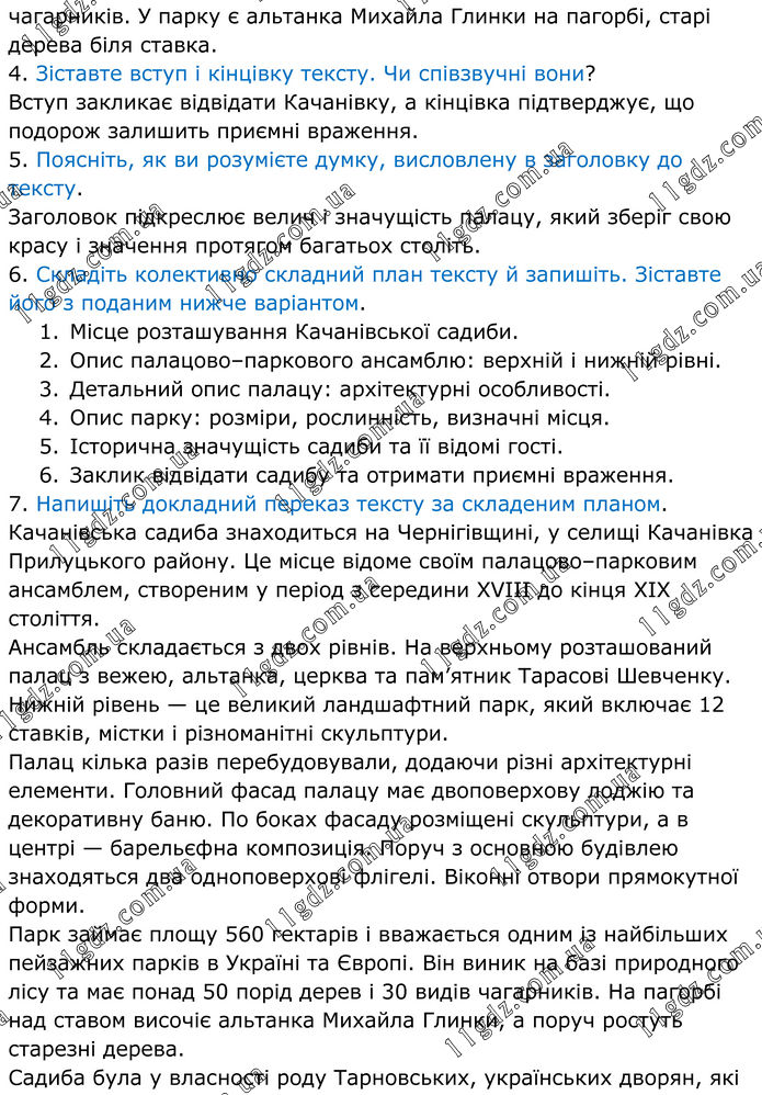 4. Зіставте вступ і кінцівку тексту. Чи співзвучні вони? Вступ закликає відвідати Качанівку, а кінцівка підтверджує, що подорож залишить приємні враження. 5. Поясніть, як ви розумієте думку, висловлену в заголовку до тексту. Заголовок підкреслює велич і значущість палацу, який зберіг свою красу і значення протягом багатьох століть. 6. Складіть колективно складний план тексту й запишіть. Зіставте його з поданим нижче варіантом. 1. Місце розташування Качанівської садиби. 2. Опис палацово–паркового ансамблю: верхній і нижній рівні. 3. Детальний опис палацу: архітектурні особливості. 4. Опис парку: розміри, рослинність, визначні місця. 5. Історична значущість садиби та її відомі гості. 6. Заклик відвідати садибу та отримати приємні враження. 7. Напишіть докладний переказ тексту за складеним планом. Качанівська садиба знаходиться на Чернігівщині, у селищі Качанівка Прилуцького району. Це місце відоме своїм палацово–парковим ансамблем, створеним у період з середини XVIII до кінця XIX століття. Ансамбль складається з двох рівнів. На верхньому розташований палац з вежею, альтанка, церква та пам’ятник Тарасові Шевченку. Нижній рівень — це великий ландшафтний парк, який включає 12 ставків, містки і різноманітні скульптури. Палац кілька разів перебудовували, додаючи різні архітектурні елементи. Головний фасад палацу має двоповерхову лоджію та декоративну баню. По боках фасаду розміщені скульптури, а в центрі — барельєфна композиція. Поруч з основною будівлею знаходяться два одноповерхові флігелі. Віконні отвори прямокутної форми. Парк займає площу 560 гектарів і вважається одним із найбільших пейзажних парків в Україні та Європі. Він виник на базі природного лісу та має понад 50 порід дерев і 30 видів чагарників. На пагорбі над ставом височіє альтанка Михайла Глинки, а поруч ростуть старезні дерева. Садиба була у власності роду Тарновських, українських дворян, які підтримували культуру і мистецтво. Вони організовували літературні, музичні і мистецькі заходи. У палаці гостювали відомі письменники і митці, зокрема Тарас Шевченко, Микола Гоголь, Михайло Глинка, Ілля Рєпін та інші. Автор запрошує відвідати Качанівську садибу, адже ця подорож залишить лише приємні враження і дозволить побачити унікальне поєднання архітектури, природи та історії.