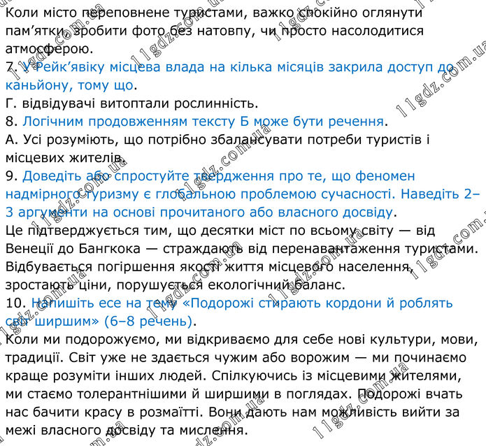 Що міг би сказати на підтвердження своєї думки Ярослав? Коли місто переповнене туристами, важко спокійно оглянути пам’ятки, зробити фото без натовпу, чи просто насолодитися атмосферою. 7. У Рейк’явіку місцева влада на кілька місяців закрила доступ до каньйону, тому що. Г. відвідувачі витоптали рослинність. 8. Логічним продовженням тексту Б може бути речення. А. Усі розуміють, що потрібно збалансувати потреби туристів і місцевих жителів. 9. Доведіть або спростуйте твердження про те, що феномен надмірного туризму є глобальною проблемою сучасності. Наведіть 2–3 аргументи на основі прочитаного або власного досвіду. Це підтверджується тим, що десятки міст по всьому світу — від Венеції до Бангкока — страждають від перенавантаження туристами. Відбувається погіршення якості життя місцевого населення, зростають ціни, порушується екологічний баланс. 10. Напишіть есе на тему «Подорожі стирають кордони й роблять світ ширшим» (6–8 речень). Коли ми подорожуємо, ми відкриваємо для себе нові культури, мови, традиції. Світ уже не здається чужим або ворожим — ми починаємо краще розуміти інших людей. Спілкуючись із місцевими жителями, ми стаємо толерантнішими й ширшими в поглядах. Подорожі вчать нас бачити красу в розмаїтті. Вони дають нам можливість вийти за межі власного досвіду та мислення.