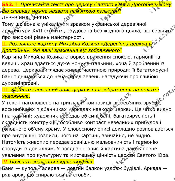 553. І. Прочитайте текст про церкву Святого Юра в Дрогобичі. Чому цю споруду можна назвати пам’яткою культури? ДЕРЕВ’ЯНА ЦЕРКВА Тому що вона є унікальним зразком української дерев’яної архітектури XVII століття, збудована без жодного цвяха, що свідчить про високий рівень майстерності. II. Розгляньте картину Михайла Козика «Дерев’яна церква в Дрогобичі». Які ваші враження від зображеного? Картина Михайла Козика створює враження спокою, гармонії та величі. Храм здається дуже монументальним, хоча й зроблений із дерева. Церква виглядає живою частиною природи: її багатоярусні бані піднімаються до неба серед зелені, нагадуючи про глибокі духовні корені. III. Зіставте словесний опис церкви та її зображення на полотні художника. У тексті наголошено на триглавій композиції, дерев’яних зрубах, восьмибічних підбанниках і аркадах навколо церкви. Це чітко видно і на картині: художник передав об’ємні бані, багатоярусність і складність конструкції, особливо контраст невеликих прибудов і головного об’єму храму. У словесному описі докладно розповідається про внутрішні розписи, чого на картині, звичайно, не видно. Натомість живопис передає зовнішню мальовничість і гармонію споруди із довкіллям. У поєднанні опис й картина дають повне уявлення про культурну та мистецьку цінність церкви Святого Юра. IV. Поясніть значення виділених слів. Баня — купол. Галерея — довгий балкон уздовж будівлі. Аркада — ряд арок, що спираються на стовби.