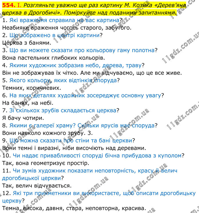 554. І. Розгляньте уважно ще раз картину М. Козика «Дерев’яна церква в Дрогобичі». Поміркуйте над поданими запитаннями. 1. Які враження справила на вас картина? Неабияке враження чогось старого, забутого. 2. Що зображено в центрі картини? Церква з банями. 3. Що ви можете сказати про кольорову гаму полотна? Вона пастельних глибоких кольорів. 4. Якими художник зобразив небо, дерева, траву? Він не зображував їх чітко. Але ми відчуваємо, що це все живе. 5. Якого кольору, яких відтінків споруда? Темних, коричневих. 6. На яких деталях художник зосереджує основну увагу? На банях, на небі. 7. Зі скількох зрубів складається церква? Я бачу чотири. 8. Якими є галереї храму? Скільки ярусів має споруда? Вони навколо кожного зрубу. 3. 9. Що можна сказати про стіни та бані церкви? Вони темні і виразні, ніби височіють над деревами. 10. Чи надає привабливості споруді бічна прибудова з куполом? Так, вона геометризує простір. 11. Чи зумів художник показати неповторність, красу й велич дрогобицької церкви? Так, велич відчувається. 12. Які три прикметники ви використаєте, щоб описати дрогобицьку церкву? Темна, висока, давня, стара, неповторна, красива.