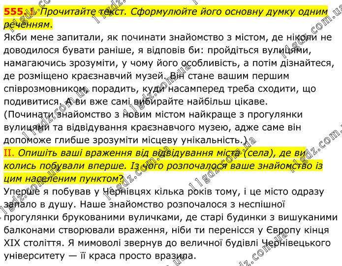 555. І. Прочитайте текст. Сформулюйте його основну думку одним реченням. Якби мене запитали, як починати знайомство з містом, де ніколи не доводилося бувати раніше, я відповів би: пройдіться вулицями, намагаючись зрозуміти, у чому його особливість, а потім дізнайтеся, де розміщено краєзнавчий музей. Він стане вашим першим співрозмовником, порадить, куди насамперед треба сходити, що подивитися. А ви вже самі вибирайте найбільш цікаве. (Починати знайомство з новим містом найкраще з прогулянки вулицями та відвідування краєзнавчого музею, адже саме він допоможе глибше зрозуміти місцеву унікальність.) II. Опишіть ваші враження від відвідування міста (села), де ви колись побували вперше. Із чого розпочалося ваше знайомство із цим населеним пунктом? Уперше я побував у Чернівцях кілька років тому, і це місто одразу запало в душу. Наше знайомство розпочалося з неспішної прогулянки брукованими вуличками, де старі будинки з вишуканими балконами створювали враження, ніби ти перенісся у Європу кінця ХІХ століття. Я мимоволі звернув до величної будівлі Чернівецького університету — її краса просто вразила.
