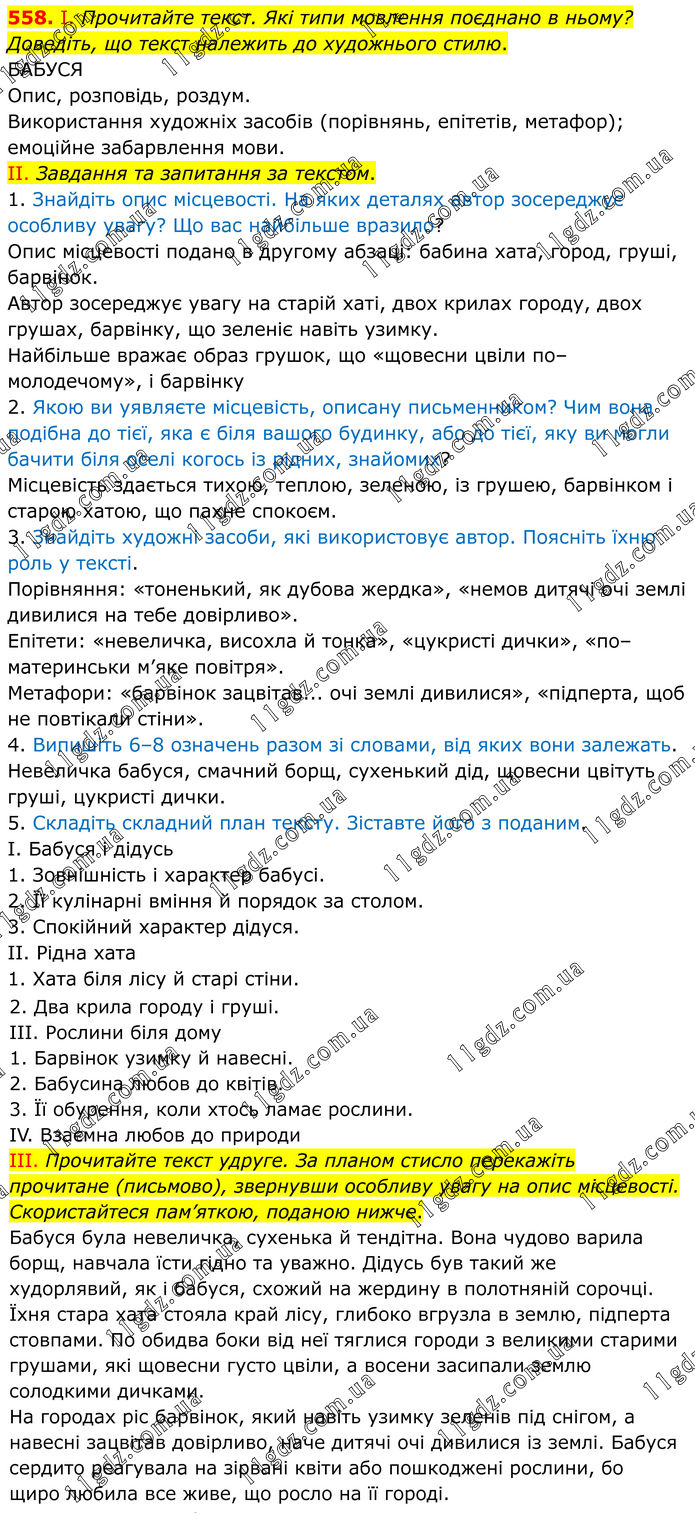 558. І. Прочитайте текст. Які типи мовлення поєднано в ньому? Доведіть, що текст належить до художнього стилю. БАБУСЯ Опис, розповідь, роздум. Використання художніх засобів (порівнянь, епітетів, метафор); емоційне забарвлення мови. II. Завдання та запитання за текстом. 1. Знайдіть опис місцевості. На яких деталях автор зосереджує особливу увагу? Що вас найбільше вразило? Опис місцевості подано в другому абзаці: бабина хата, город, груші, барвінок. Автор зосереджує увагу на старій хаті, двох крилах городу, двох грушах, барвінку, що зеленіє навіть узимку. Найбільше вражає образ грушок, що «щовесни цвіли по–молодечому», і барвінку 2. Якою ви уявляєте місцевість, описану письменником? Чим вона подібна до тієї, яка є біля вашого будинку, або до тієї, яку ви могли бачити біля оселі когось із рідних, знайомих? Місцевість здається тихою, теплою, зеленою, із грушею, барвінком і старою хатою, що пахне спокоєм. 3. Знайдіть художні засоби, які використовує автор. Поясніть їхню роль у тексті. Порівняння: «тоненький, як дубова жердка», «немов дитячі очі землі дивилися на тебе довірливо». Епітети: «невеличка, висохла й тонка», «цукристі дички», «по–материнськи м’яке повітря». Метафори: «барвінок зацвітав... очі землі дивилися», «підперта, щоб не повтікали стіни». 4. Випишіть 6–8 означень разом зі словами, від яких вони залежать. Невеличка бабуся, смачний борщ, сухенький дід, щовесни цвітуть груші, цукристі дички. 5. Складіть складний план тексту. Зіставте його з поданим. I. Бабуся і дідусь 1. Зовнішність і характер бабусі. 2. Її кулінарні вміння й порядок за столом. 3. Спокійний характер дідуся. II. Рідна хата 1. Хата біля лісу й старі стіни. 2. Два крила городу і груші. III. Рослини біля дому 1. Барвінок узимку й навесні. 2. Бабусина любов до квітів. 3. Її обурення, коли хтось ламає рослини. IV. Взаємна любов до природи ІІІ. Прочитайте текст удруге. За планом стисло перекажіть прочитане (письмово), звернувши особливу увагу на опис місцевості. Скористайтеся пам’яткою, поданою нижче. Бабуся була невеличка, сухенька й тендітна. Вона чудово варила борщ, навчала їсти гідно та уважно. Дідусь був такий же худорлявий, як і бабуся, схожий на жердину в полотняній сорочці. Їхня стара хата стояла край лісу, глибоко вгрузла в землю, підперта стовпами. По обидва боки від неї тяглися городи з великими старими грушами, які щовесни густо цвіли, а восени засипали землю солодкими дичками. На городах ріс барвінок, який навіть узимку зеленів під снігом, а навесні зацвітав довірливо, наче дитячі очі дивилися із землі. Бабуся сердито реагувала на зірвані квіти або пошкоджені рослини, бо щиро любила все живе, що росло на її городі.