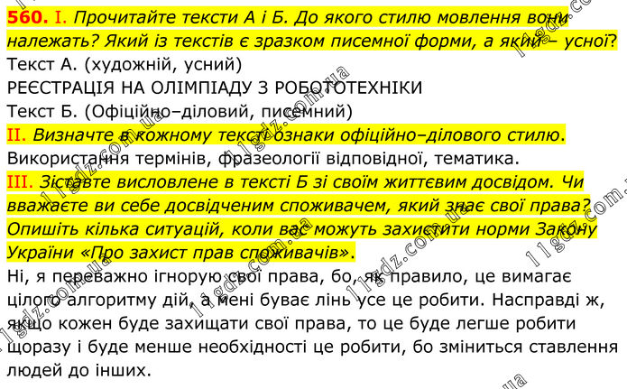 560. І. Прочитайте тексти А і Б. До якого стилю мовлення вони належать? Який із текстів є зразком писемної форми, а який – усної? Текст А. (художній, усний) РЕЄСТРАЦІЯ НА ОЛІМПІАДУ З РОБОТОТЕХНІКИ Текст Б. (Офіційно–діловий, писемний) II. Визначте в кожному тексті ознаки офіційно–ділового стилю. Використання термінів, фразеології відповідної, тематика. III. Зіставте висловлене в тексті Б зі своїм життєвим досвідом. Чи вважаєте ви себе досвідченим споживачем, який знає свої права? Опишіть кілька ситуацій, коли вас можуть захистити норми Закону України «Про захист прав споживачів». Ні, я переважно ігнорую свої права, бо, як правило, це вимагає цілого алгоритму дій, а мені буває лінь усе це робити. Насправді ж, якщо кожен буде захищати свої права, то це буде легше робити щоразу і буде менше необхідності це робити, бо зміниться ставлення людей до інших.
