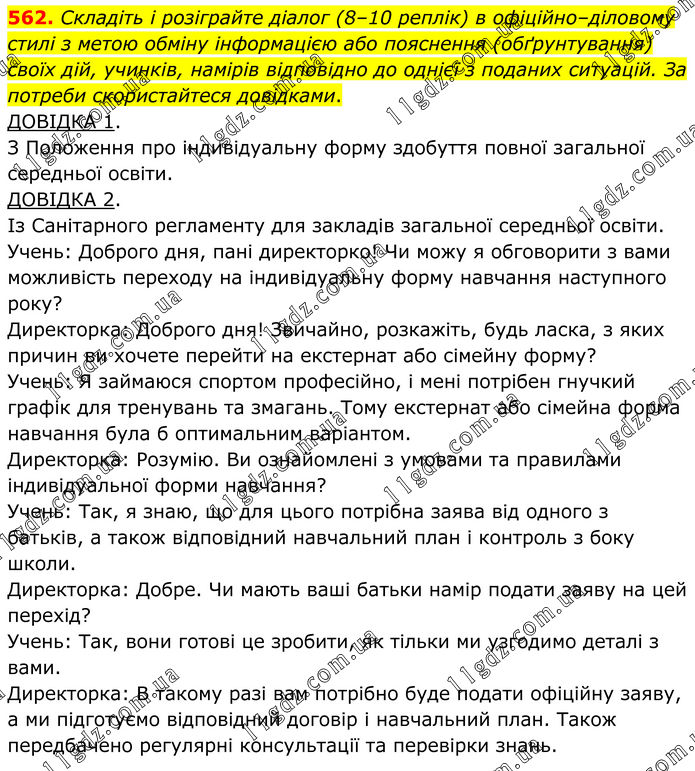 562. Складіть і розіграйте діалог (8–10 реплік) в офіційно–діловому стилі з метою обміну інформацією або пояснення (обґрунтування) своїх дій, учинків, намірів відповідно до однієї з поданих ситуацій. За потреби скористайтеся довідками. ДОВІДКА 1. З Положення про індивідуальну форму здобуття повної загальної середньої освіти. ДОВІДКА 2. Із Санітарного регламенту для закладів загальної середньої освіти. Учень: Доброго дня, пані директорко! Чи можу я обговорити з вами можливість переходу на індивідуальну форму навчання наступного року? Директорка: Доброго дня! Звичайно, розкажіть, будь ласка, з яких причин ви хочете перейти на екстернат або сімейну форму? Учень: Я займаюся спортом професійно, і мені потрібен гнучкий графік для тренувань та змагань. Тому екстернат або сімейна форма навчання була б оптимальним варіантом. Директорка: Розумію. Ви ознайомлені з умовами та правилами індивідуальної форми навчання? Учень: Так, я знаю, що для цього потрібна заява від одного з батьків, а також відповідний навчальний план і контроль з боку школи. Директорка: Добре. Чи мають ваші батьки намір подати заяву на цей перехід? Учень: Так, вони готові це зробити, як тільки ми узгодимо деталі з вами. Директорка: В такому разі вам потрібно буде подати офіційну заяву, а ми підготуємо відповідний договір і навчальний план. Також передбачено регулярні консультації та перевірки знань.