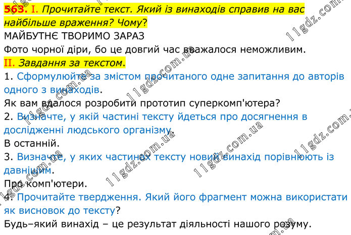 563. І. Прочитайте текст. Який із винаходів справив на вас найбільше враження? Чому? МАЙБУТНЄ ТВОРИМО ЗАРАЗ Фото чорної діри, бо це довгий час вважалося неможливим. II. Завдання за текстом. 1. Сформулюйте за змістом прочитаного одне запитання до авторів одного з винаходів. Як вам вдалося розробити прототип суперкомп'ютера? 2. Визначте, у якій частині тексту йдеться про досягнення в дослідженні людського організму. В останній. 3. Визначте, у яких частинах тексту новий винахід порівнюють із давнішим. Про комп'ютери. 4. Прочитайте твердження. Який його фрагмент можна використати як висновок до тексту? Будь–який винахід – це результат діяльності нашого розуму.