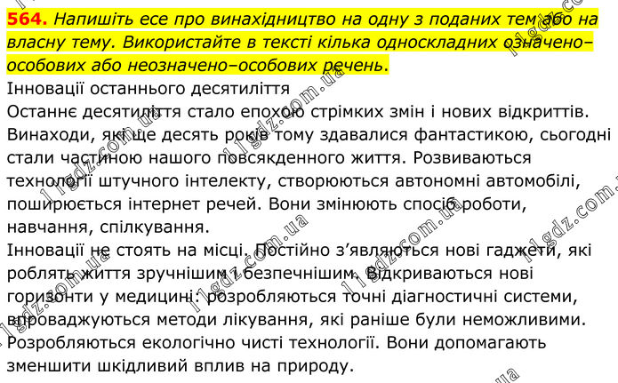 564. Напишіть есе про винахідництво на одну з поданих тем або на власну тему. Використайте в тексті кілька односкладних означено–особових або неозначено–особових речень. Інновації останнього десятиліття Останнє десятиліття стало епохою стрімких змін і нових відкриттів. Винаходи, які ще десять років тому здавалися фантастикою, сьогодні стали частиною нашого повсякденного життя. Розвиваються технології штучного інтелекту, створюються автономні автомобілі, поширюється інтернет речей. Вони змінюють спосіб роботи, навчання, спілкування. Інновації не стоять на місці. Постійно з’являються нові гаджети, які роблять життя зручнішим і безпечнішим. Відкриваються нові горизонти у медицині: розробляються точні діагностичні системи, впроваджуються методи лікування, які раніше були неможливими. Розробляються екологічно чисті технології. Вони допомагають зменшити шкідливий вплив на природу.