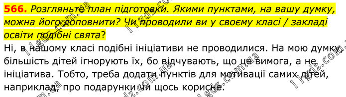 566. Розгляньте план підготовки. Якими пунктами, на вашу думку, можна його доповнити? Чи проводили ви у своєму класі / закладі освіти подібні свята? Ні, в нашому класі подібні ініціативи не проводилися. На мою думку, більшість дітей ігнорують їх, бо відчувають, що це вимога, а не ініціатива. Тобто, треба додати пунктів для мотивації самих дітей, наприклад, про подарунки чи щось корисне.