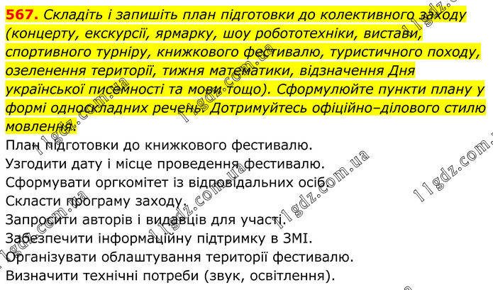 567. Складіть і запишіть план підготовки до колективного заходу (концерту, екскурсії, ярмарку, шоу робототехніки, вистави, спортивного турніру, книжкового фестивалю, туристичного походу, озеленення території, тижня математики, відзначення Дня української писемності та мови тощо). Сформулюйте пункти плану у формі односкладних речень. Дотримуйтесь офіційно–ділового стилю мовлення. План підготовки до книжкового фестивалю. Узгодити дату і місце проведення фестивалю. Сформувати оргкомітет із відповідальних осіб. Скласти програму заходу. Запросити авторів і видавців для участі. Забезпечити інформаційну підтримку в ЗМІ. Організувати облаштування території фестивалю. Визначити технічні потреби (звук, освітлення).