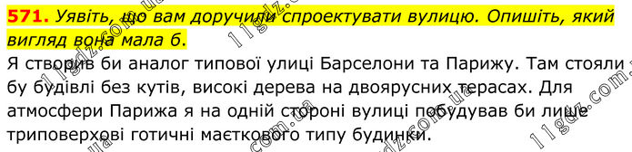 571. Уявіть, що вам доручили спроектувати вулицю. Опишіть, який вигляд вона мала б. Я створив би аналог типової улиці Барселони та Парижу. Там стояли бу будівлі без кутів, високі дерева на двоярусних терасах. Для атмосфери Парижа я на одній стороні вулиці побудував би лише триповерхові готичні маєткового типу будинки.