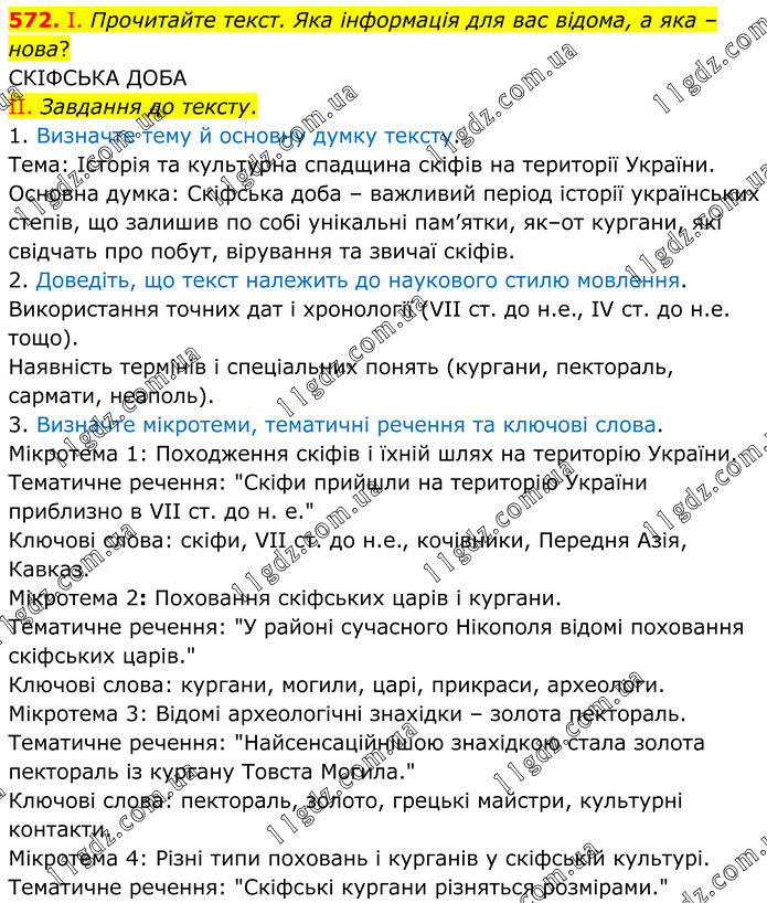 572. І. Прочитайте текст. Яка інформація для вас відома, а яка – нова? СКІФСЬКА ДОБА II. Завдання до тексту. 1. Визначте тему й основну думку тексту. Тема: Історія та культурна спадщина скіфів на території України. Основна думка: Скіфська доба – важливий період історії українських степів, що залишив по собі унікальні пам’ятки, як–от кургани, які свідчать про побут, вірування та звичаї скіфів. 2. Доведіть, що текст належить до наукового стилю мовлення. Використання точних дат і хронології (VII ст. до н.е., IV ст. до н.е. тощо). Наявність термінів і спеціальних понять (кургани, пектораль, сармати, неаполь). 3. Визначте мікротеми, тематичні речення та ключові слова. Мікротема 1: Походження скіфів і їхній шлях на територію України. Тематичне речення: "Скіфи прийшли на територію України приблизно в VII ст. до н. е." Ключові слова: скіфи, VII ст. до н.е., кочівники, Передня Азія, Кавказ. Мікротема 2: Поховання скіфських царів і кургани. Тематичне речення: "У районі сучасного Нікополя відомі поховання скіфських царів." Ключові слова: кургани, могили, царі, прикраси, археологи. Мікротема 3: Відомі археологічні знахідки – золота пектораль. Тематичне речення: "Найсенсаційнішою знахідкою стала золота пектораль із кургану Товста Могила." Ключові слова: пектораль, золото, грецькі майстри, культурні контакти. Мікротема 4: Різні типи поховань і курганів у скіфській культурі. Тематичне речення: "Скіфські кургани різняться розмірами."