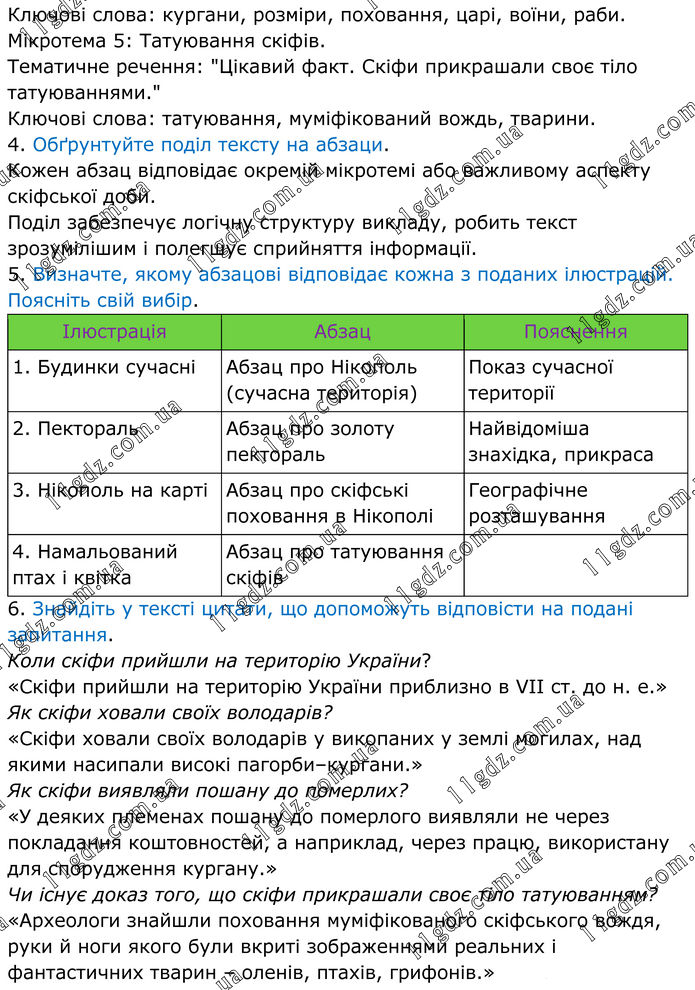 Ключові слова: кургани, розміри, поховання, царі, воїни, раби. Мікротема 5: Татуювання скіфів. Тематичне речення: "Цікавий факт. Скіфи прикрашали своє тіло татуюваннями." Ключові слова: татуювання, муміфікований вождь, тварини. 4. Обґрунтуйте поділ тексту на абзаци. Кожен абзац відповідає окремій мікротемі або важливому аспекту скіфської доби. Поділ забезпечує логічну структуру викладу, робить текст зрозумілішим і полегшує сприйняття інформації. 5. Визначте, якому абзацові відповідає кожна з поданих ілюстрацій. Поясніть свій вибір. Ілюстрація Абзац Пояснення 1. Будинки сучасні Абзац про Нікополь (сучасна територія) Показ сучасної території 2. Пектораль Абзац про золоту пектораль Найвідоміша знахідка, прикраса 3. Нікополь на карті Абзац про скіфські поховання в Нікополі Географічне розташування 4. Намальований птах і квітка Абзац про татуювання скіфів 6. Знайдіть у тексті цитати, що допоможуть відповісти на подані запитання. Коли скіфи прийшли на територію України? «Скіфи прийшли на територію України приблизно в VII ст. до н. е.» Як скіфи ховали своїх володарів? «Скіфи ховали своїх володарів у викопаних у землі могилах, над якими насипали високі пагорби–кургани.» Як скіфи виявляли пошану до померлих? «У деяких племенах пошану до померлого виявляли не через покладання коштовностей, а наприклад, через працю, використану для спорудження кургану.» Чи існує доказ того, що скіфи прикрашали своє тіло татуюванням? «Археологи знайшли поховання муміфікованого скіфського вождя, руки й ноги якого були вкриті зображеннями реальних і фантастичних тварин – оленів, птахів, грифонів.»