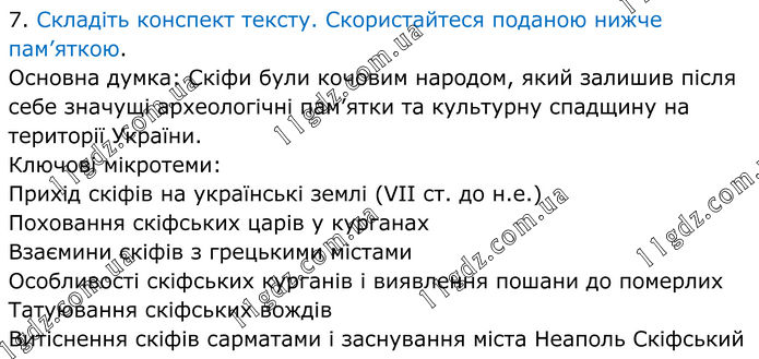 7. Складіть конспект тексту. Скористайтеся поданою нижче пам’яткою. Основна думка: Скіфи були кочовим народом, який залишив після себе значущі археологічні пам’ятки та культурну спадщину на території України. Ключові мікротеми: Прихід скіфів на українські землі (VII ст. до н.е.) Поховання скіфських царів у курганах Взаємини скіфів з грецькими містами Особливості скіфських курганів і виявлення пошани до померлих Татуювання скіфських вождів Витіснення скіфів сарматами і заснування міста Неаполь Скіфський