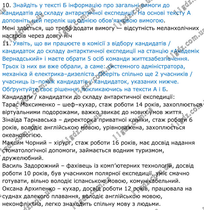 10. Знайдіть у тексті Б інформацію про загальні вимоги до кандидатів до складу антарктичної експедиції. На основі тексту А доповніть цей перелік ще однією обов'язковою вимогою. Мені здається, що треба додати вимогу — відсутність меланхолічних настроїв через довгу ніч 11. Уявіть, що ви працюєте в комісії з відбору кандидатів / кандидаток до складу антарктичної експедиції на станцію «Академік Вернадський» і маєте обрати 5 осіб команди життєзабезпечення. Трьох із них ви вже обрали, а саме: системного адміністратора, механіка й електрика–дизеліста. Оберіть спільно ще 2 учасників / учасниць із–поміж кандидатів / кандидаток, указаних нижче. Обґрунтуйте своє рішення, покликаючись на тексти А і Б. Кандидати / кандидатки до складу антарктичної експедиції: Тарас Максименко – шеф–кухар, стаж роботи 14 років, захоплюється віртуальними подорожами, важко звикає до нових умов життя. Зінаїда Тарнавська – директорка приватної клініки, стаж роботи 6 років, володіє англійською мовою, урівноважена, захоплюється океанологією. Максим Чорний – хірург, стаж роботи 16 років, має досвід надання стоматологічної допомоги, займається водним туризмом, дружелюбний. Василь Задорожний – фахівець із комп’ютерних технологій, досвід роботи 10 років, був учасником полярної експедиції, уміє смачно готувати, вільно володіє іспанською мовою, комунікабельний. Оксана Архипенко – кухар, досвід роботи 12 років, працювала на суднах далекого плавання, володіє англійською мовою, неконфліктна, легко знаходить спільну мову з людьми.