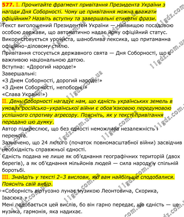 577. І. Прочитайте фрагмент привітання Президента України з нагоди Дня Соборності. Чому це привітання можна вважати офіційним? Назвіть вступну та завершальні етикетні фрази. Текст виголошений Президентом України — найвищою посадовою особою держави, що автоматично надає йому офіційний статус. Використовується урочиста, шаноблива лексика, що притаманна офіційно–діловому стилю. Привітання стосується державного свята — Дня Соборності, що є важливою національною датою. Вступна: «Дорогий народе!» Завершальні: «З Днем Соборності, дорогий народе!» «З Днем Соборності, непоборні!» «Слава Україні!») II. День Соборності нагадує нам, що єдність українських земель в умовах російсько–української війни є обов’язковою передумовою успішного спротиву агресору. Поясніть, як у тексті привітання передано цю думку. Автор підкреслює, що без єдності неможлива незалежність і перемога. Зазначено, що 24 лютого (початок повномасштабної війни) засвідчив необхідність справжньої єдності. Єдність подана не лише як об’єднання географічних територій (двох берегів), а як об’єднання мільйонів людей — сила народу у спільній боротьбі. III. Знайдіть у тексті 2–3 вислови, які вам найбільше сподобалися. Поясніть свій вибір. «Соборність віртуозно лунає музикою Леонтовича, Скорика, Івасюка.» Мені подобається цей вислів, бо він гарно передає, що єдність — це музика, гармонія, яка надихає.