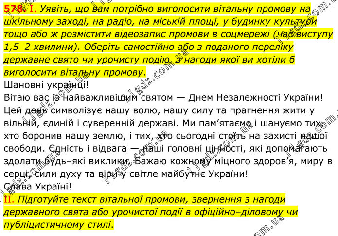 578. І. Уявіть, що вам потрібно виголосити вітальну промову на шкільному заході, на радіо, на міській площі, у будинку культури тощо або ж розмістити відеозапис промови в соцмережі (час виступу 1,5–2 хвилини). Оберіть самостійно або з поданого переліку державне свято чи урочисту подію, з нагоди якої ви хотіли б виголосити вітальну промову. Шановні українці! Вітаю вас із найважливішим святом — Днем Незалежності України! Цей день символізує нашу волю, нашу силу та прагнення жити у вільній, єдиній і суверенній державі. Ми пам’ятаємо і шануємо тих, хто боронив нашу землю, і тих, хто сьогодні стоїть на захисті нашої свободи. Єдність і відвага — наші головні цінності, які допомагають здолати будь–які виклики. Бажаю кожному міцного здоров’я, миру в серці, сили духу та віри у світле майбутнє України! Слава Україні! II. Підготуйте текст вітальної промови, звернення з нагоди державного свята або урочистої події в офіційно–діловому чи публіцистичному стилі.